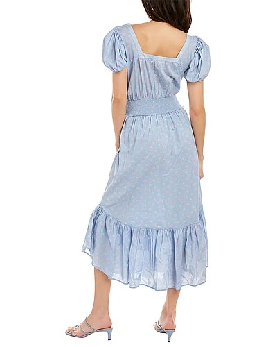 - Begonia Midi Dress in baby blue with puff sleeves, square neck, smocked waist, ruffle hem, and side seam pockets