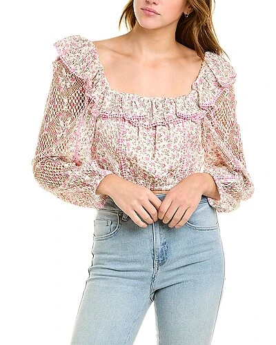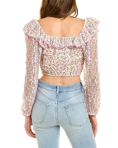 - Dorabella Crop Top in petunia pink with off-the-shoulder sleeves with elasticized cuffs, ruffle trim and lace pompom detailing