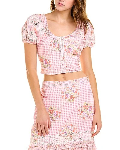 - Izetta Top in berry picnic with elasticized neckline, lace paneling, self-tie center bust, and puff sleeves