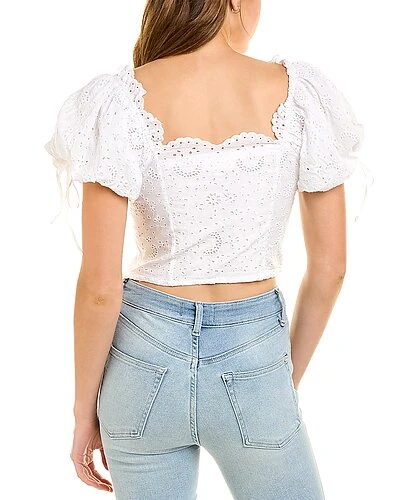 - Melina Top in antique white with eyelet lace design, scalloped neckline, elastic-trim puff sleeves, and self-tie bow at cuffs