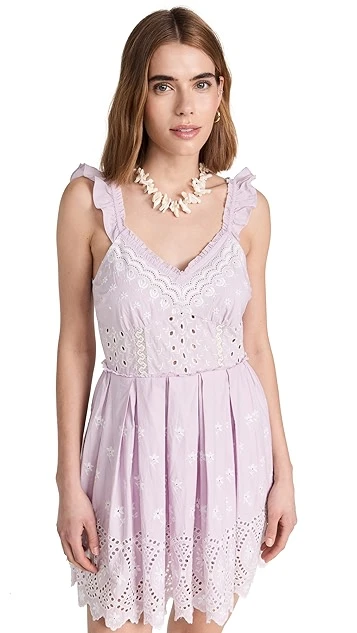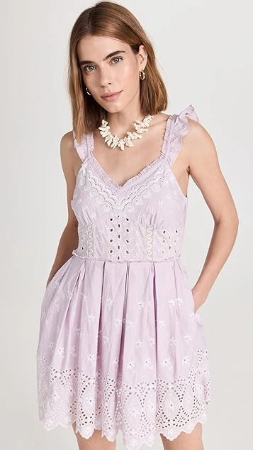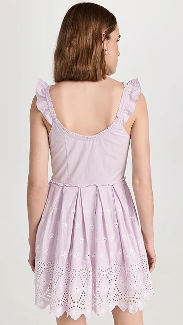 A truly delightful take on the classic summertime mini dress from LoveShackFancy, featuring a box-pleated skirt and an intricate array of lace and eyelet details.