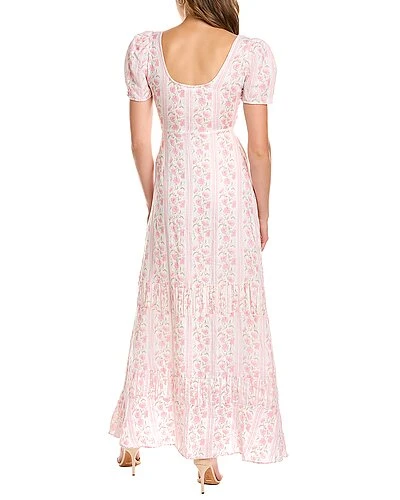 - Poole Linen Dress in morning bliss pink with scoop neck, shirred shoulders, and pleated skirt panels