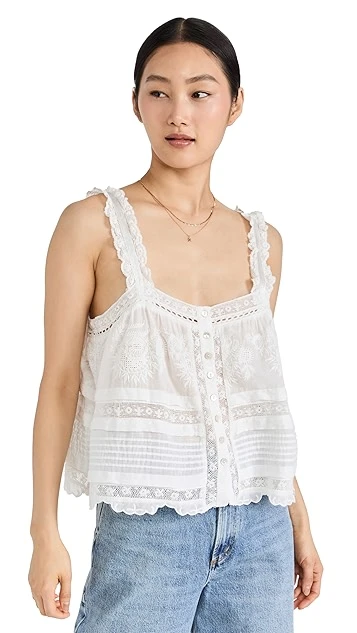 Fluttery, bright-white voile composes this breezy LoveShackFancy top, which is accented with touches of tonal lace and eyelet patterning.