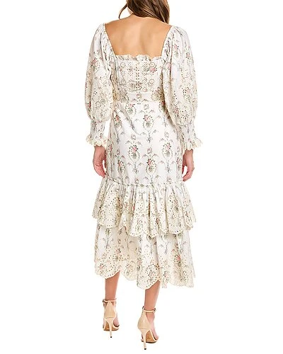 - Toulon Dress in vanilla kisses with eyelet lace design, square neckline, blouson sleeves, smocked cuffs, and tiered skirt