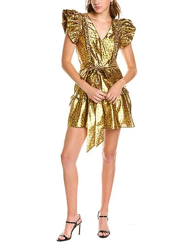 - Zoya Dress in safari with metallic design, V-neck, ruffle trim, and self-tie sash at waist